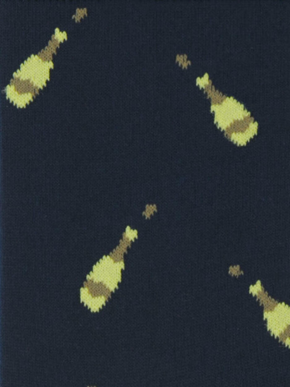 Calzino corto Bottle Blue in puro cotone egiziano di alta qualità, leggermente elasticizzato per una perfetta vestibilità. Polsino a costine, punta e talloni rinforzati. Fantasia con motivo a bottiglia di bollicine di ispirazione classica, ma divertente e originale.