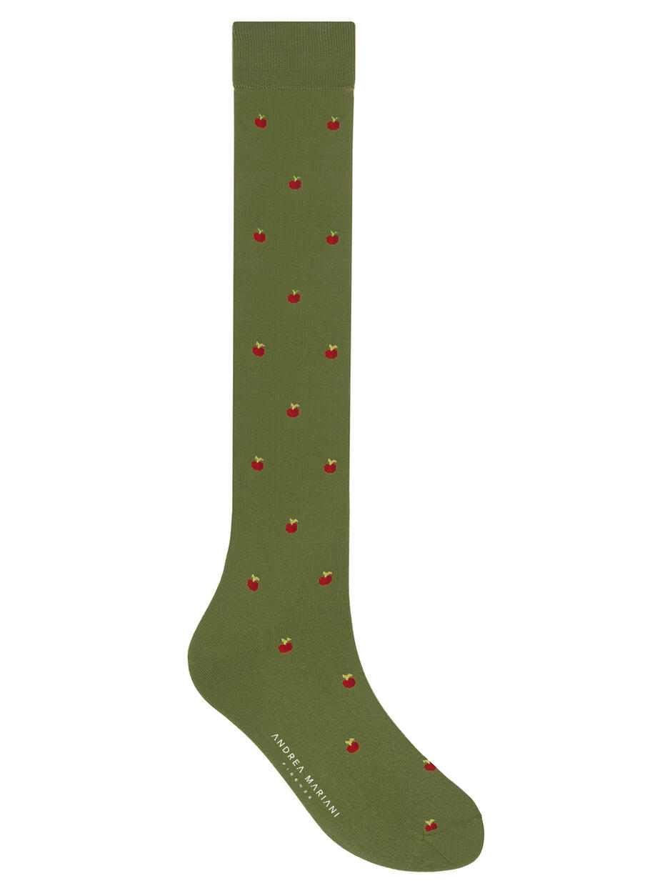 Calzini lunghi con fantasie APPLE GREEN in puro cotone egiziano di alta qualità, leggermente elasticizzato per una perfetta vestibilità. Polsino a costine, punta e talloni rinforzati. Caratterizzati da una fantasia con motivo a mela di ispirazione classica, i calzini lunghi verde APPLE GREEN risultano divertenti e originali.
