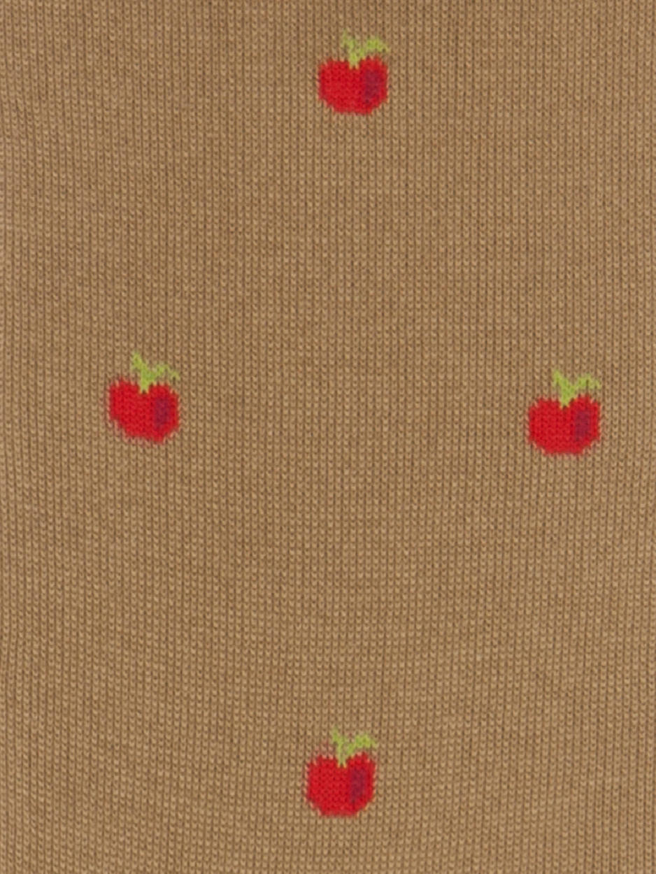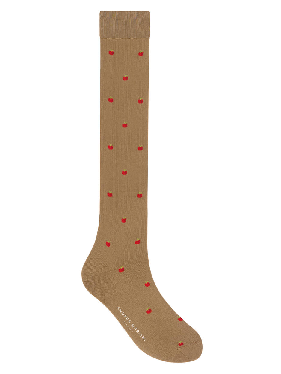 Calzino lungo in puro cotone egiziano di alta qualità, leggermente elasticizzato per una perfetta vestibilità. Polsino a costine, punta e talloni rinforzati. Fantasia con motivo a mela di ispirazione classica, ma divertente e originale.
